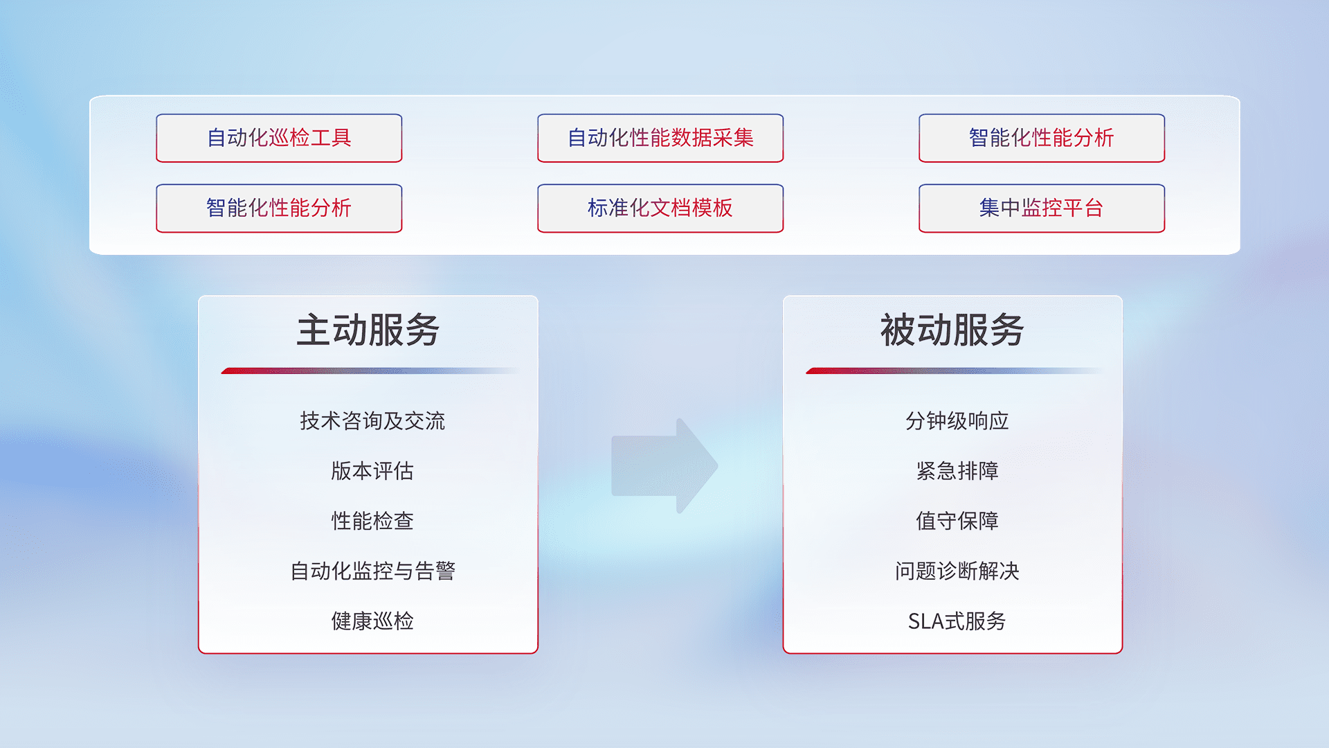 智能化工具和标准化文档,,保障服务质量,,,,提供主动服务(包含技术咨询、、、、版本评估、、、性能检查、、、自动化监控与告警、、、、健康巡检)和被动服务包含(分钟级响应、、紧急排障、、、、值守保障、、、问题诊断解决、、SLA服务)。。