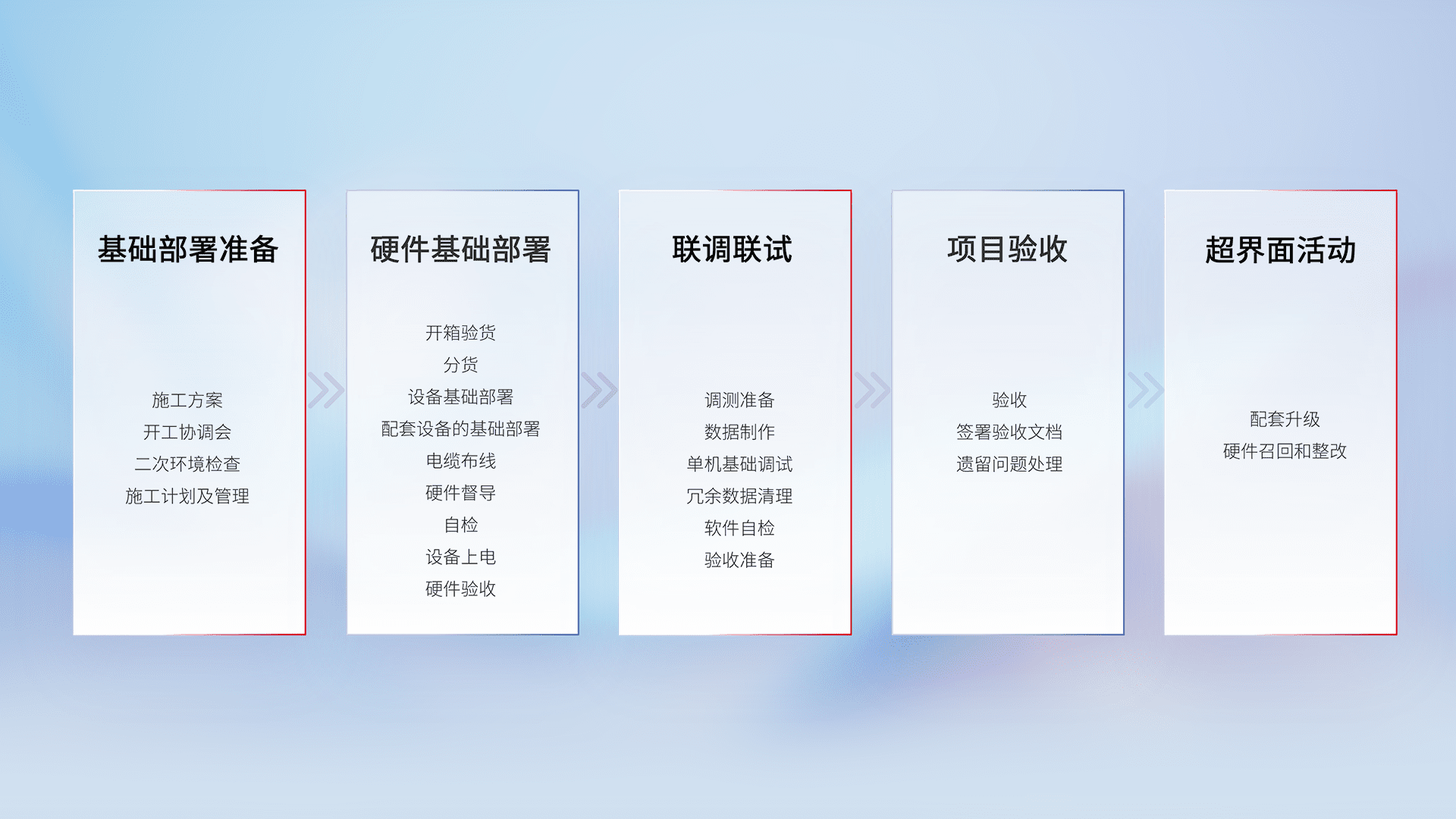 从基础部署准备、、硬件基础部署、、、联调联试、、、、项目验收、、、越界面活动的全过程可追溯,,,保证施工质量和进度。。。
