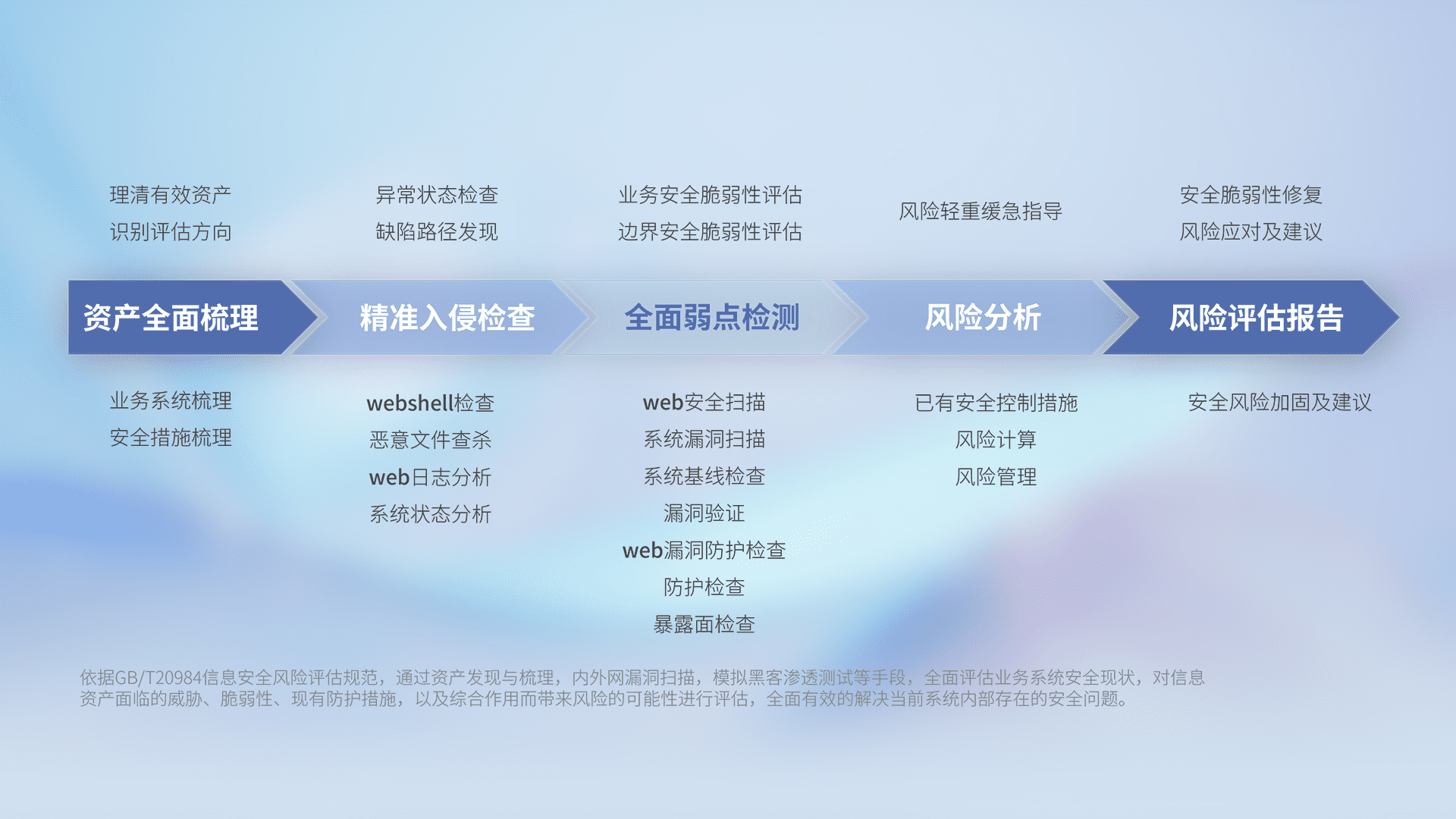 针对客户行业特性,,以专业的安全服务+多厂商联合解决方案提供专属的一站式安全管理服务,,,,帮助客户全面感知网络空间威胁,,基于识别、、、、检测、、、、分析、、、、防护、、、、监测、、响应的服务理论模型,,,从方案咨询、、、、集成交付、、评估验证、、、、优化加固、、、运维运营,,,,致力于为客户提供完整的闭环管理式安全服务。。以实战经验为客户打造高抵御风险的安全体系,,帮助客户发现威胁、、对抗威胁、、、处置威胁,,,,不断积累安全对抗能力,,持续保障数字化安全。。
